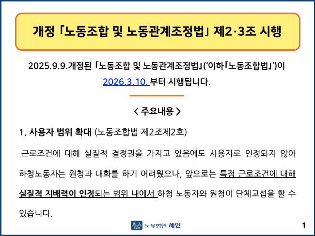2025.9.9.개정된 「노동조합 및 노동관계조정법」(‘이하「노동조합법」’)이 2026.3.10.부터 시행됩니다.