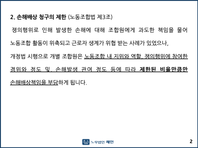 2. 손해배상 청구의 제한 (노동조합법 제3조) 쟁의행위로 인해 발생한 손해에 대해 조합원에게 과도한 책임을 물어 노동조합 활동이 위축되고 근로자 생계가 위협 받는 사례가 있었으나, 개정법 시행으로 개별 조합원은 노동조합 내 지위와 역할, 쟁의행위에 참여한 경위와 정도 및. 손해발생 관여 정도 등에 따라 제한된 비율만큼만 손해배상책임을 부담하게 됩니다.